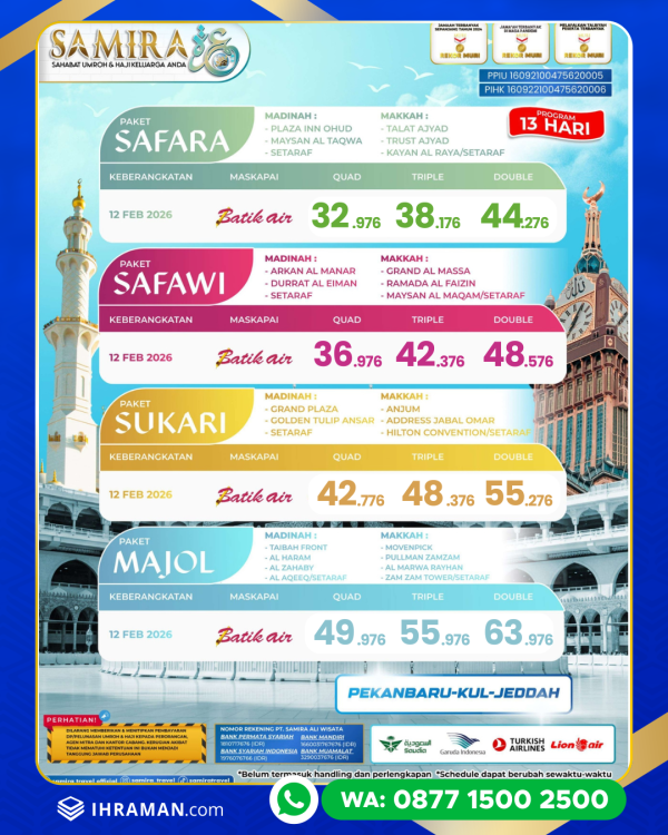 Nikmati perjalanan ibadah yang lebih berkelas melalui Paket Umroh SUKARI Februari 2026 – Program 13 Hari bersama Samira. Program ini dirancang bagi jamaah yang menginginkan kenyamanan ekstra selama berada di Tanah Suci dengan durasi ibadah yang lebih panjang, akomodasi hotel berkualitas, serta pelayanan profesional dari awal hingga akhir perjalanan. Paket SUKARI menjadi pilihan tepat untuk Anda yang ingin menjalankan umroh dengan suasana tenang, tertata, dan penuh kekhusyukan.